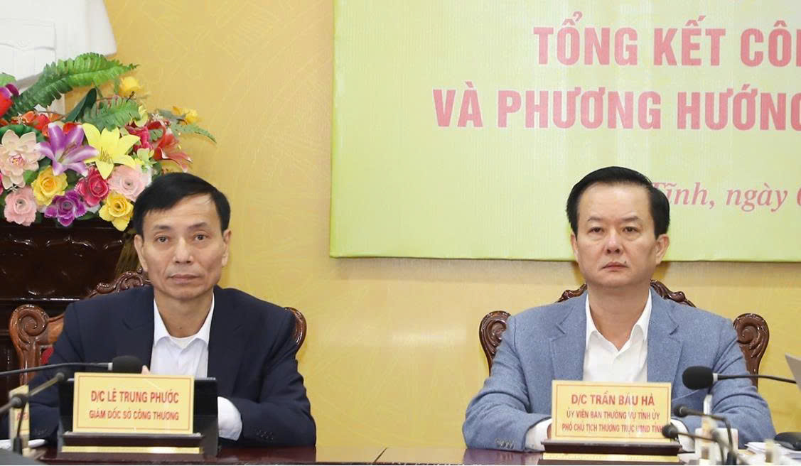 Đồng chí Trần Báu Hà - Phó Chủ tịch Thường trực UBND tỉnh cùng với đồng chí Lê Trung Phước - Giám đốc Sở Công Thương điều hành Hội nghị tại điểm cầu tỉnh Hà Tĩnh