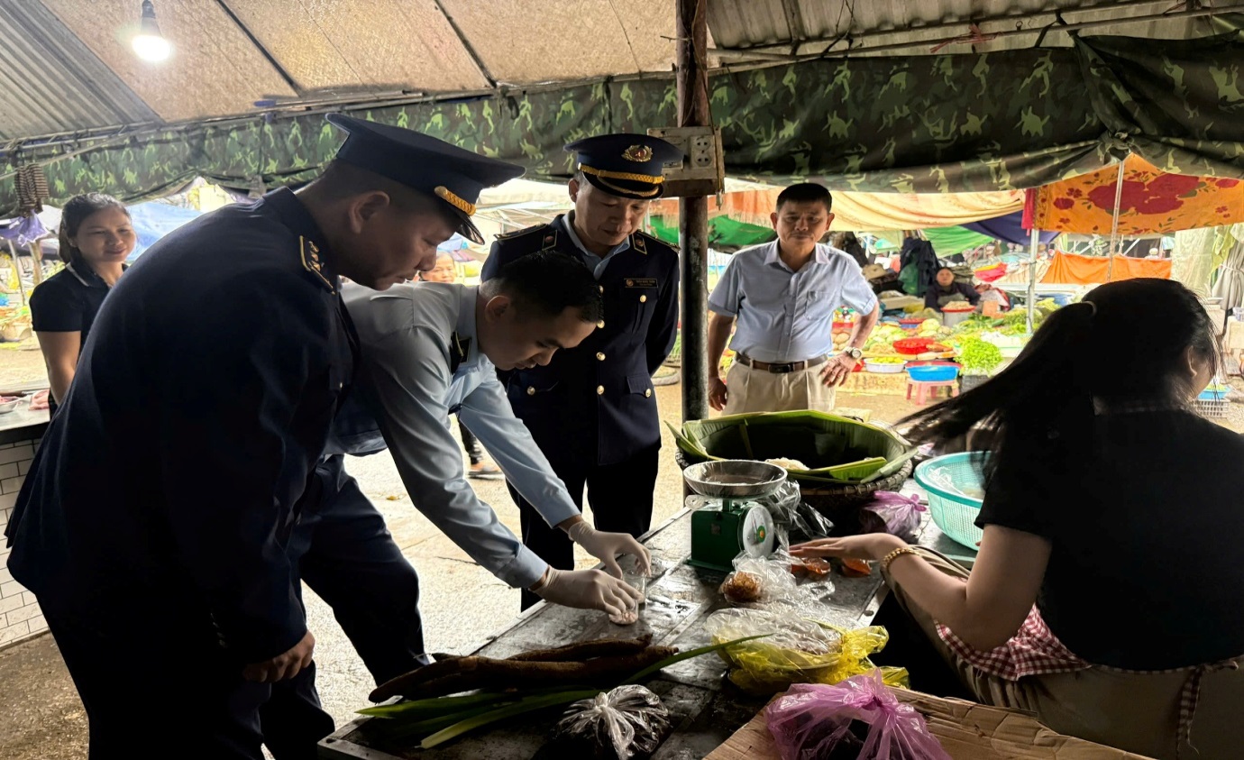 Đội QLTT số 2 lấy mẫu test nhanh thực phẩm tại chợ Phố Châu (Ảnh: Q.D)