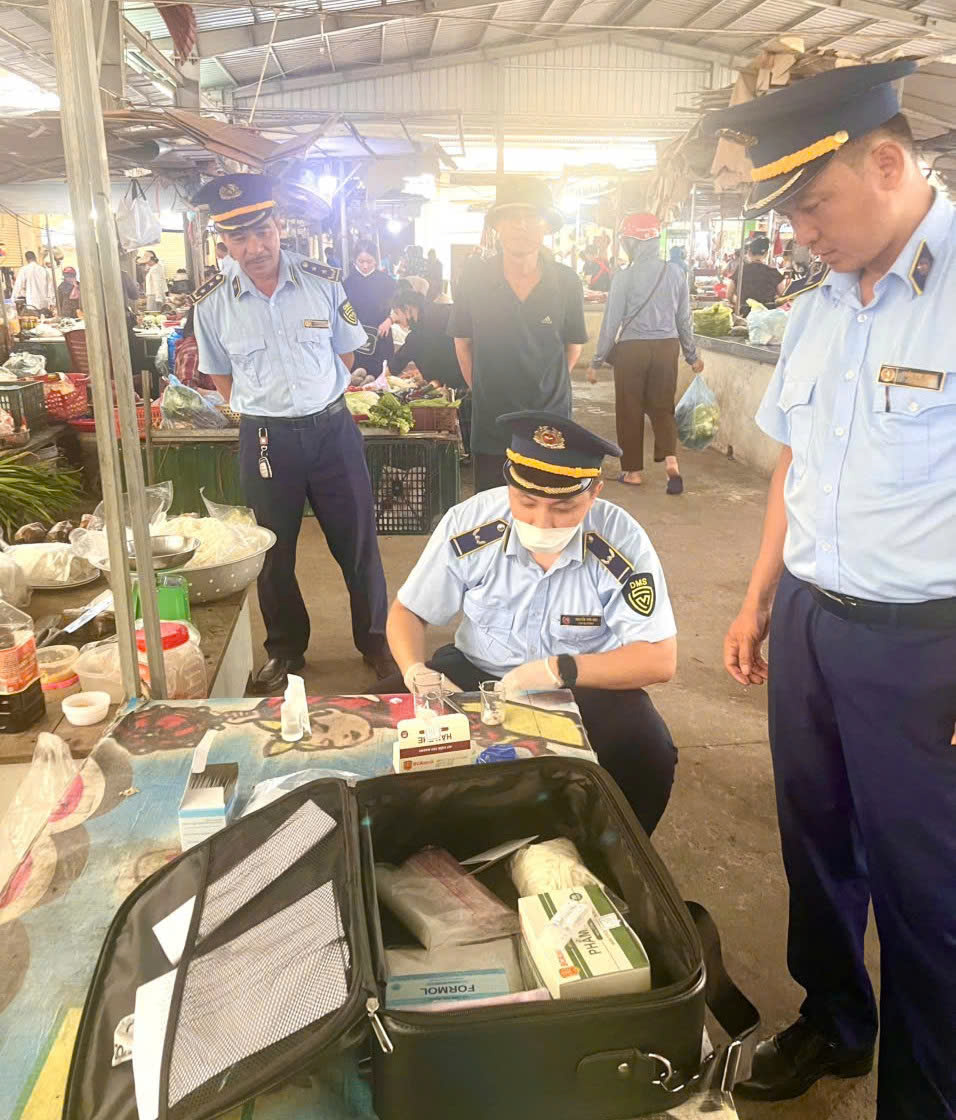 Đội QLTT số 1 test nhanh các quầy kinh doanh tại chợ Bình Hương (Ảnh V.H)