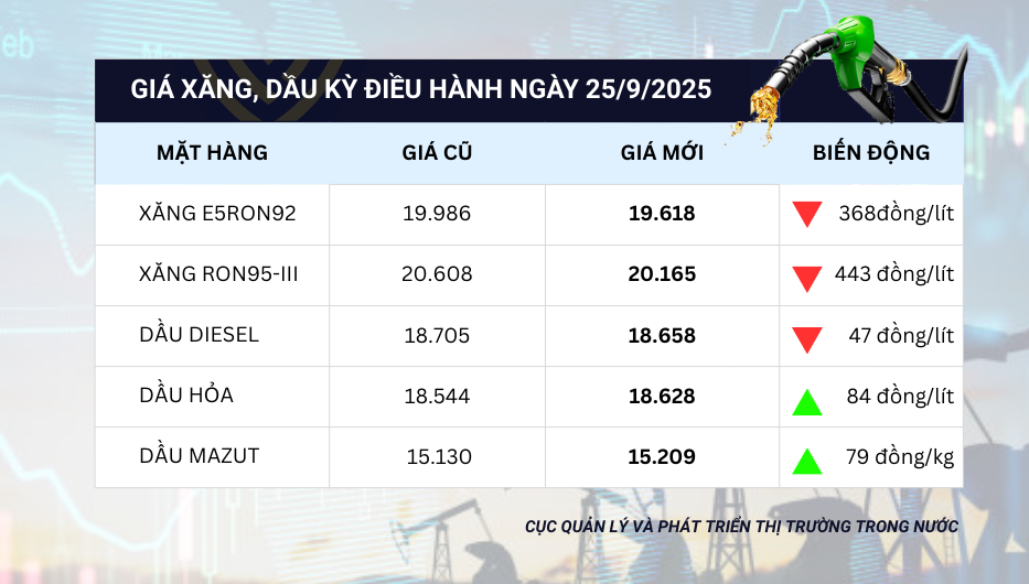 Bình quân giá thành phẩm xăng dầu thế giới giữa kỳ điều hành giá ngày 18/9/2025 và kỳ điều hành ngày 25/9/2025 là: 78,604 USD/thùng xăng RON92 dùng để pha chế xăng E5RON92; 80,474 USD/thùng xăng RON95; 87,274 USD/thùng dầu hỏa; 87,902 USD/thùng dầu điêzen 0,05S; 404,720 USD/tấn dầu mazut 180CST 3,5S.