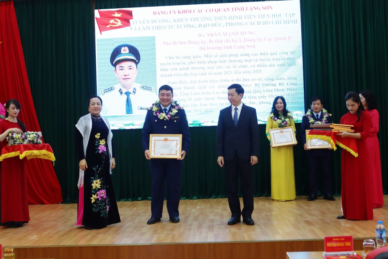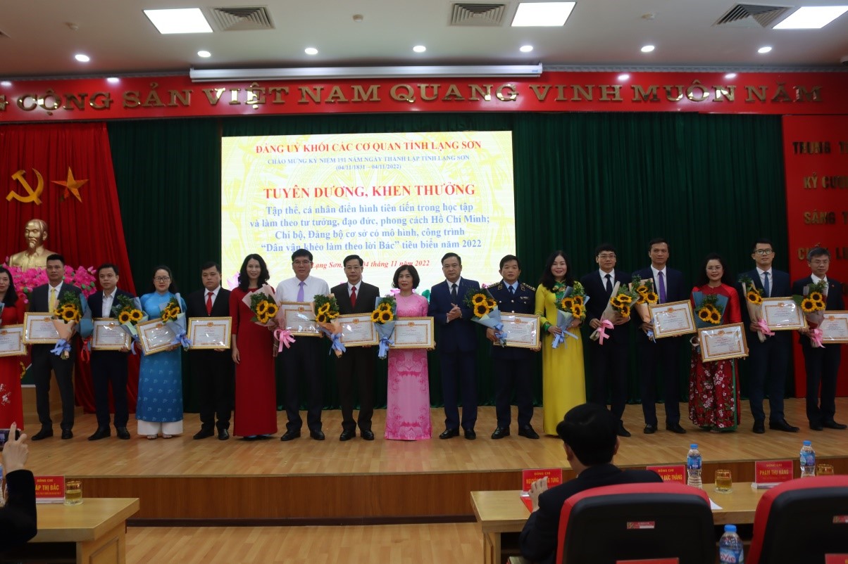 Để ghi nhận, biểu dương các tập thể, cá nhân đã có thành tích xuất sắc trong học tập và làm theo tư tưởng, đạo đức, phong cách Hồ Chí Minh; các đơn vị có mô hình, công trình “Dân vận khéo làm theo lời Bác” tiêu biểu năm 2022, tại buổi Lễ, Ban Thường vụ Đảng ủy Khối đã Tuyên dương, khen thưởng 15 tập thể, 21 cá nhân điển hình tiên tiến “Học tập và làm theo tư tưởng, đạo đức, phong cách Hồ Chí Minh” và 14 tập thể đã có thành tích trong chỉ đạo, xây dựng mô hình, công trình “Dân vận khéo làm theo lời Bác” tiêu biểu năm 2022. Trong đó, Đảng ủy Cục QLTT Lạng Sơn vinh dự được Tuyên dương, khen thưởng ở cả hai nội dung khen thưởng.