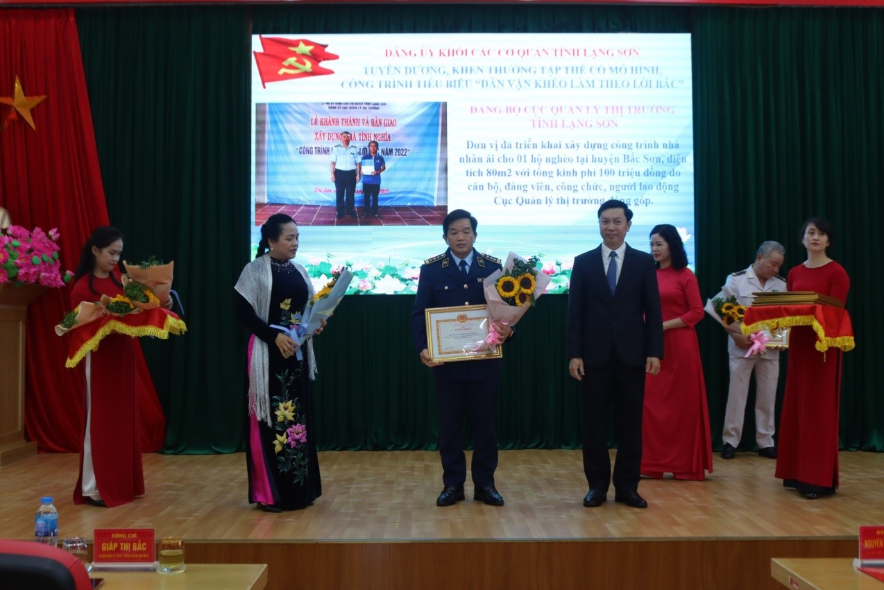 Đảng ủy Cục QLTT Lạng Sơn là một trong 14 tập thể được vinh danh, tuyên dương, khen thưởng vì đã có thành tích trong chỉ đạo và tổ chức xây dựng được mô hình, công trình “Dân vận khéo làm theo lời Bác” tiêu biểu năm 2022. Đơn vị đã triển khai xây dựng công trình nhà nhân ái cho 01 hộ nghèo là gia đình chính sách thờ cúng liệt sĩ tại huyện Bắc Sơn. Công trình có diện tích 80 m2 với tổng kinh phí hỗ trợ 100 triệu đồng do cán bộ, đảng viên, công chức, người lao động của Cục đóng góp.